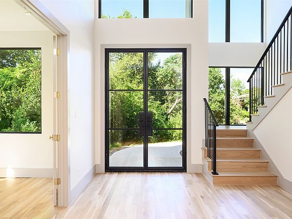 Expansive windows and three sets of sliding doors flood the interiors with natural light and open to the outdoors. Steel entry and balcony doors, soundproofed windows, and white oak hardwood floors throughout set the tone for quality and style. Two upstairs balconies provide serene tree-top views, while the main level showcases a soaring limestone fireplace and a spacious great room.