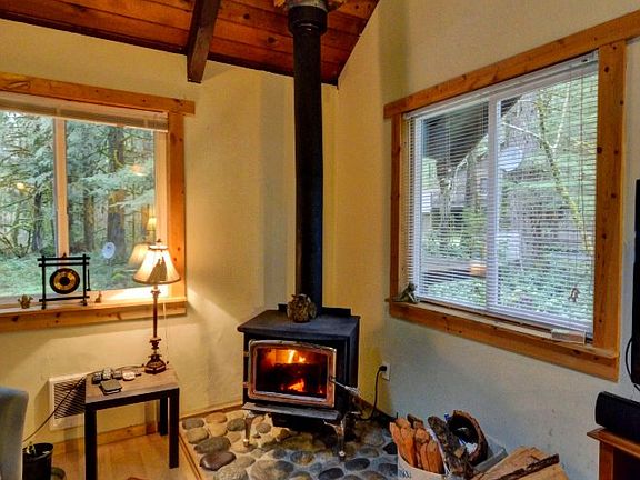 Mt. Hood chalet on wooded half acre in Rhododendron on Bear Creek! Your own tiny house with cozy wood stove, laminate floors, tons of windows and an open floor plan. Perfect for mountain getaway tucked away location with amenities. Easy access to hiway 26 for skiing only 20 minutes away. Campfire pit, deck and your own private woods! Dip your toes in Bear Creek. Circular driveway for parking. 1 hour PDX! Affordable!
