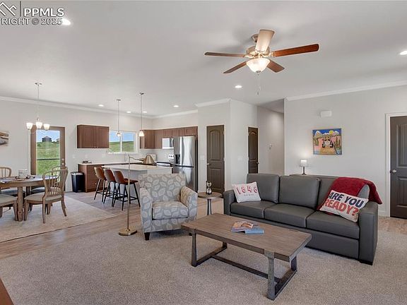 Welcome to this stunning 2024 custom ranch-style home, perfectly situated on 5.04 acres in highly sought-after Black Forest. Designed for effortless main-level living, this home features a brand-new asphalt driveway, a spacious 3-car garage with oversized RV bay. Step inside to 9' ceilings, crown molding, abundant natural light, and custom window treatments throughout. The open-concept layout flows seamlessly from the living room into the kitchen and dining area, creating a warm and welcoming space for everyday living or entertaining. The kitchen is beautifully appointed with quartz countertops, stainless steel appliances, a large center island, pantry, and rich brown cabinetry. The primary suite offers a luxurious retreat with an oversized shower, soaking tub, double vanity with quartz countertops, and private placement at the rear of the home. Two additional bedrooms offer ample closet space and share a full bathroom with granite countertops and a tiled shower/tub combo. A well-placed laundry/mudroom just off the garage adds everyday convenience. With no interior stairs and a new 2025 (propane) gas furnace, this home is designed for comfort, efficiency, and accessibility. Outside, take in wide open views and a stunning sightline to Pikes Peak. Whether you envision adding a barn, cultivating a garden, or simply enjoying the space and serenity, the possibilities are endless. With easy access to Black Forest Road, you’re close to everything while enjoying the peace of acreage living. This is a rare opportunity to own a move-in ready home with modern finishes, open space, and true livability in one of Colorado’s most desirable communities.