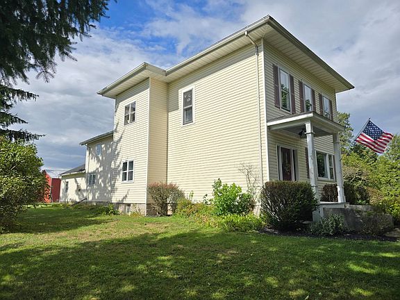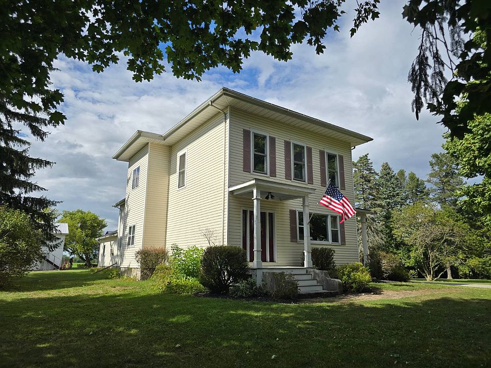 THIS PROPERTY OFFERED AT ONLINE AUCTION! Offering the historic Pfaff Homestead. This late 1800's farm house has over 3,400 square feet of living space with five bedrooms (one on the first floor) and two full baths. The front door leads to the grand curved staircase with original wood railings. French doors lead to the sprawling living room with a large bay window area and an original marble fireplace. Original wood floors lead to the formal dining room with custom built china cabinet. Eat-in country kitchen with cherry cabinets and custom woodwork. Modern appliances include a built-in oven and cooktop range.There is a wood stove in the kitchen for ambiance and additional heat. There is an additional staircase off the kitchen to the second floor. First floor laundry with washer and dryer included. Oil fired boiler heat, septic system. Monroe County water line approved and expected soon! Attached 1 car garage. Outbuildings include a 50' x 60' pole barn, plus a shop with lift and hoist, wooden horse barn, and more! This 5.5 acre property also includes a large pasture and pond. PLUS TWO OTHER PARCELS AVAILABLE TOTALING MORE THAN 100 ACRES OF TILLABLE LAND!