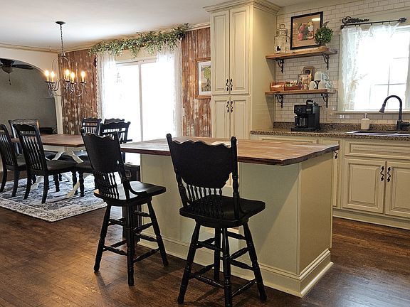 Inside, the home has an open concept layout that connects the kitchen, dining area, and living space, creating a natural flow that works well for relaxing or entertaining. The kitchen comes fully equipped with all essential appliances, Formica countertops, plenty of cabinets, a pantry, and an island bar with built-in cabinetry and two barstools. A dining table comfortably seats six. The living area is furnished with a reclining leather sectional with a chaise lounge, a smart TV, an end table, a ceiling fan, and an electric indoor fireplace that adds warmth and ambiance without extra maintenance.