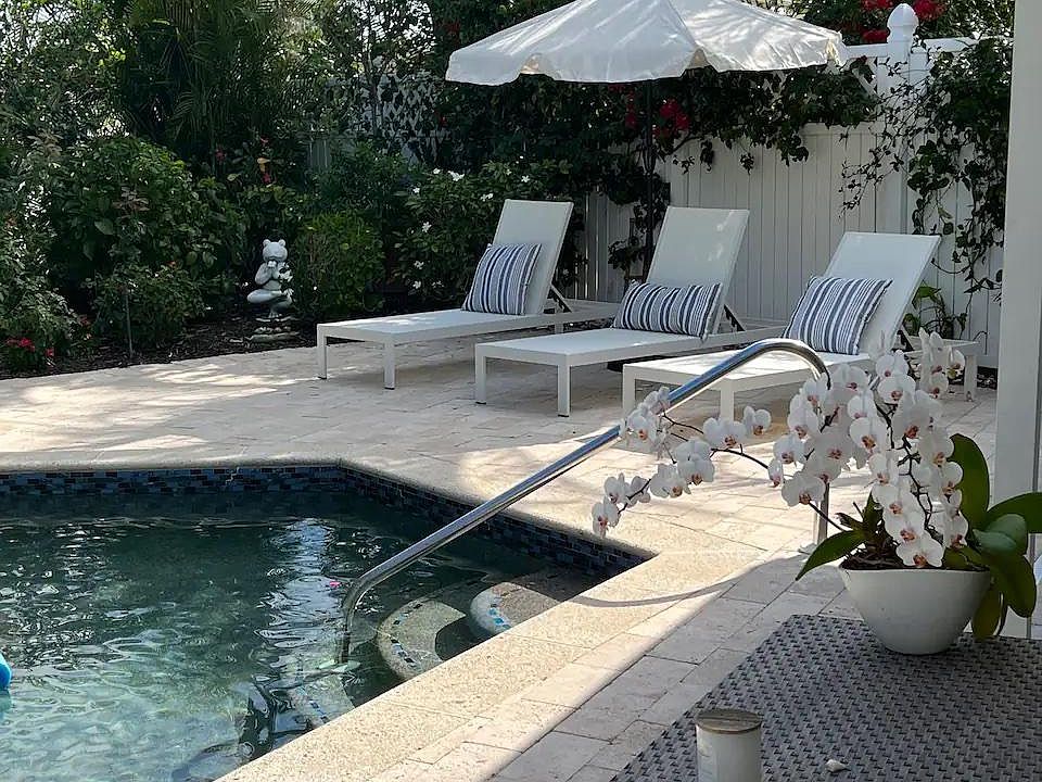 Fenced yardRecently renovatedPrivate heated pool homeLush gardenCoastal decor throughoutBeach chairs and umbrellasOversized pool