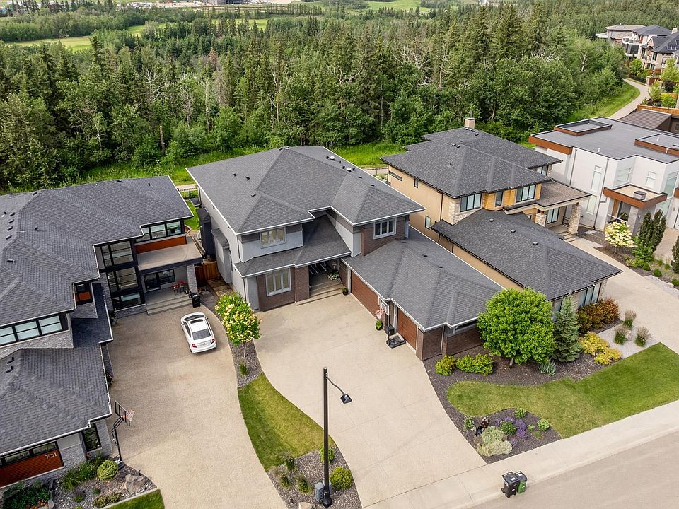 Stunning former Ace Lange Showhome offering over 5,400 sq ft of refined living space, backing onto the Whitemud Ravine & steps to Jagare Ridge Golf Course. This fully finished walkout features 4 beds, office, den, 4.5 baths, and a heated triple garage (one bay currently an office/storage). Chef inspired kitchen with Sub-Zero fridge, Wolf double gas stove, walk-in pantry, and wet bar with Sub-Zero wine cooler. 10' ceilings on main floor, massive windows, main floor deck, and upper balcony offer incredible ravine views. Luxurious primary suite with spa-like ensuite and walk-through closet. Upstairs bonus room, two bedrooms with private ensuites. Basement includes a bedroom, den, reading nook and huge rec space with a wet bar that opens to a beautifully landscaped yard ($60K+ in landscaping). Loaded with upgrades, including radon prevention system, Kinetico water softener, radiant floor heat in garage, primary ensuite & basement. A perfect blend of luxury, comfort, and nature in sought-after Jagare Ridge.
