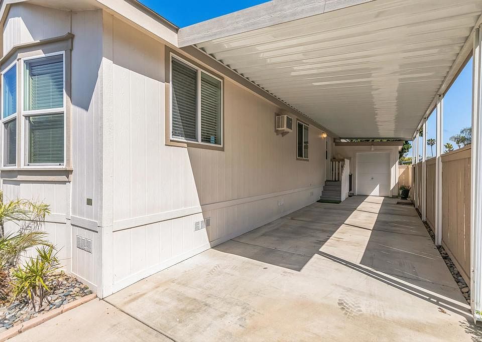Price Improvement! Tucked away in a peaceful corner of a beautifully maintained community, this charming home offers the best of relaxed coastal living just 0.4 miles from Beacons Beach. Perfect for beach-loving couples or anyone who craves the sand and sea, the location alone is hard to beat but it’s the thoughtful touches throughout the home that truly make it special. Step inside to discover a spacious, open-concept kitchen with bar seating that flows seamlessly into a light-filled living area, where large windows invite in the golden California sun. Whether you're entertaining or enjoying a quiet morning coffee, this space feels effortlessly welcoming. The bedroom retreat is generously sized and equipped with both a ceiling fan and AC wall unit, ensuring comfort year-round. A stacked washer and dryer tucked into a convenient laundry closet keeps daily chores simple and efficient. Recent upgrades include a nearly new water heater, updated plumbing fixtures, and wood blinds throughout, giving the home a fresh, modern feel while maintaining its coastal charm. Outside, the low-maintenance landscaping surrounds a private patio and deck, ideal for sunset dinners or surfboard waxing sessions. There's also a large shed perfect for storage or a weekend workshop and an attached carport with two parking spaces, plus three visitor spots conveniently located right next door. Set within a friendly, all-ages park with a clubhouse, pool, and recreation room, you'll enjoy a true sense of community without the burden of HOA fees. With restaurants, shopping, and freeway access nearby, this home is the perfect blend of tranquility and convenience. To make it yours, buyers must qualify with 3x the monthly space rent. This is more than a home t’s a lifestyle. Peaceful mornings, surf-filled afternoons, and the comfort of knowing you’ve found your own little piece of Encinitas paradise.