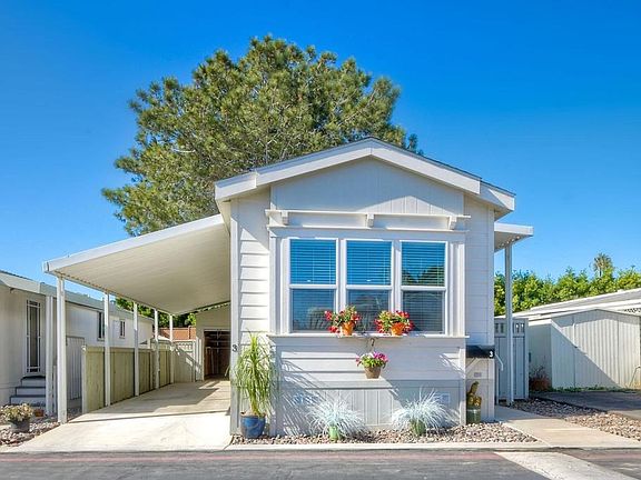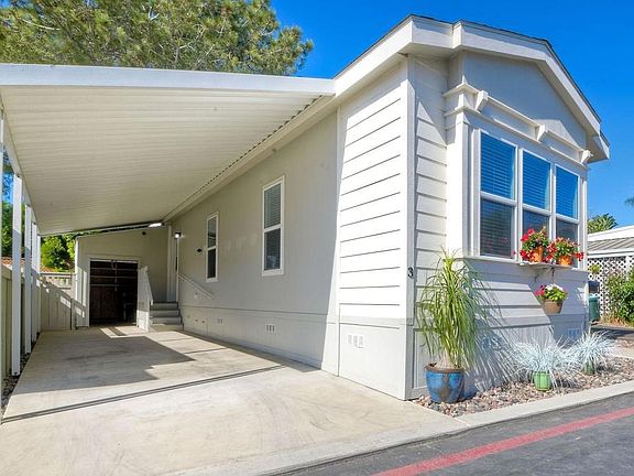 Super cute, super clean 2019 manufactured home in the Riviera mobile home park, west of the 5 Fwy in the charming beach town of Leucadia. This home is 704 sf and features 2 bedrooms and 1 bathroom and has barely been lived in. Primary bedroom is down the hall in the back. Secondary bedroom is in front, just off the living room separated by a pocket door. High ceilings and lots of windows make it light and bright. Large kitchen has refrigerator, plentiful white cabinets with a white quartz counter and huge island for additional counter seating. Light wood vinyl plank flooring throughout. Stackable washer/dryer in hall closet convey. Covered tandem carport with a huge storage room at the end. Adorable fenced side yard perfect for relaxing and enjoying the fresh air. Located on the back loop of the park, this unit is very private and quiet. Park amenities include pool, clubhouse with pool and ping-pong tables, event space w/kitchen, ample guest parking. Super close to some of the best beaches in San Diego, a variety of restaurants, shopping, public transportation and all that this charming beach town has to offer! This is a land lease park, space rent is $1960/month, but no add'l HOA. You'll love the lifestyle here!
