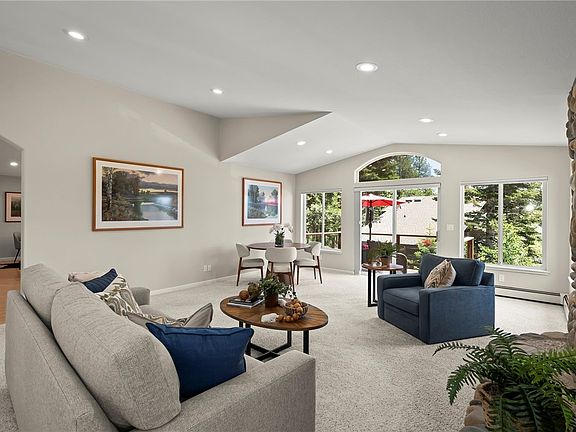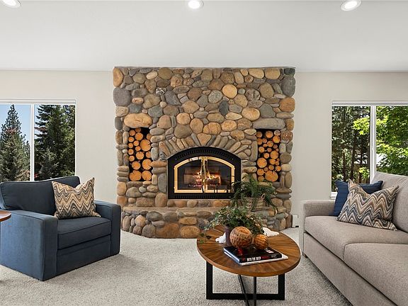 Thoughtfully designed & tastefully refurbished, this lovely 4 bedroom, 2.5 bath home offers nice mountain & filtered lake views. Recent upgrades include new interior paint & lighting throughout, quality stainless kitchen appliances, stunning quartz kitchen counters, main level window coverings & re-designed exterior front entrance. The main upper level features vaulted ceilings, inviting living room w/floor to ceiling rock Xtrordinaire F/P, kitchen w/breakfast area & bar, 2 decks & an expansive primary suite w/2-sided gas F/P & walk-in closet. The entry level offers a family room w/2 additional bedrooms, full bath, & laundry room w/direct garage access. The lower level 4th bedroom w/walk-in closet is currently used as an office & extra sleeping area. This flexible room could easily be a game room or work-out space. The sunny corner lot provides level paver driveway access to the 2-car garage w/insulated steel door. Lovely new furnishings throughout the home are negotiable in the sale.