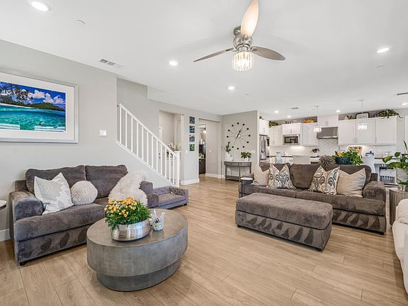 Welcome to 6990 Spumante Way, a beautifully appointed residence in the desirable Glen Loma Ranch community of Gilroy. This spacious 3,173 sq. ft. home offers 4 bedrooms and 3 full bathrooms, thoughtfully designed across two levels with a versatile floorplan. The main level features a full bedroom and bathroom, ideal for guests or multigenerational living. The heart of the home is the expansive kitchen, showcasing quartz countertops, stainless steel appliances, and abundant cabinetry that opens seamlessly to the dining and living areas. Luxury vinyl plank flooring runs throughout, creating a modern yet warm feel. Upstairs, the impressive primary suite captures sweeping views of Gilroy and offers a spa-like bathroom with dual vanities, a soaking tub, and a large walk-in closet. Step outside to a backyard designed for entertaining, complete with low-maintenance artificial turf, a covered patio, and a built-in BBQ. Additional highlights include solar power for energy efficiency and a 4,113 sq. ft. lot that maximizes both indoor and outdoor living space. Situated in a sought-after neighborhood close to parks, trails, and top amenities, this home blends comfort, style, and convenience - perfect for todays lifestyle.