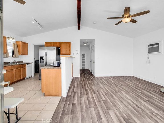 Welcome to your serene desert retreat in Desert Heights of 29 Palms! This charming 2-bedroom, 1-bathroom home, sitting on 2.5 acres, offers plenty of space and privacy (adjacent BLM Property), making it a perfect starter home for first-time buyers. As you walk in, you are greeted by vaulted ceilings with exposed wood beams, new vinyl flooring, and a cozy wood-burning fireplace, creating a warm and inviting atmosphere.
