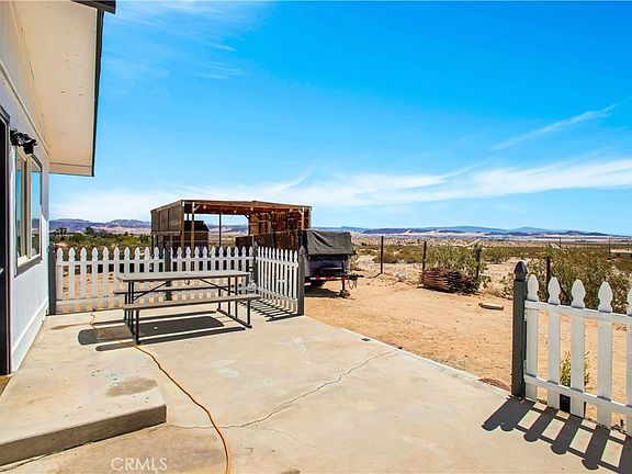 The detached carport serves as a great project space for anyone looking to expand or build. The expansive outdoor area includes ample storage space and stunning desert views, perfect for outdoor activities and relaxation. Additionally, the property features panoramic mountain views and is located off a paved road for easy access. It's also close to the military base and Joshua Tree National Park, offering both convenience and adventure.