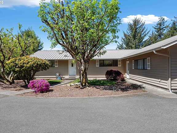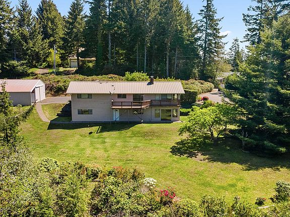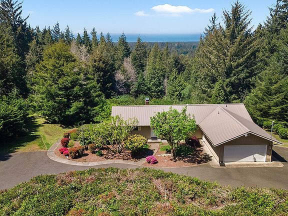 Rare Opportunity, EXCEPTIONALLY well-maintained One-Owner Home on 3.75 Private Acres, offering Ocean Views and a MASSIVE Shop. Welcome to a truly special property on Stage Road, located just 7 miles from town and a few miles out from the dunes and beaches. This lovingly cared for home was thoughtfully designed with functionality and storage in mind, the main level features a large, bright living room, cozy brick fireplace, a spacious dining area, and a well-equipped kitchen boasting custom oak cabinetry w/ pull out drawers in lower cabinets, gas stove, insta-hot water and a large walk-in pantry. Step out onto the main level deck to watch the boats sail by, while taking in the peaceful ocean views, the perfect spot to unwind and appreciate the beauty of the Oregon coast. The primary bedroom is conveniently located on the main floor offering a generous walk-in closet, built in vanity and an attached en-suite bathroom. Also found on the main level is an additional half bath and direct access to the attached double car garage making coming and going a breeze. The lower level of the home offers a spacious family room with a large built-in bookcase, wood stove, a slider leading to the backyard, wine cellar, separate canning room, two additional bedrooms, large laundry room and a full bathroom—creating an ideal setup for guests or multi-generational living! Heading outside, the property continues to impress with a very large shop featuring a built-in workshop, parking for an RV, boat and all your toys. Properties like this are a true rarity, offering ocean views, a country setting, acreage, privacy, and a sought-after location near like homes. If you’re looking for a home that has it all, this is one you don’t want to miss. Schedule your private viewing today!
