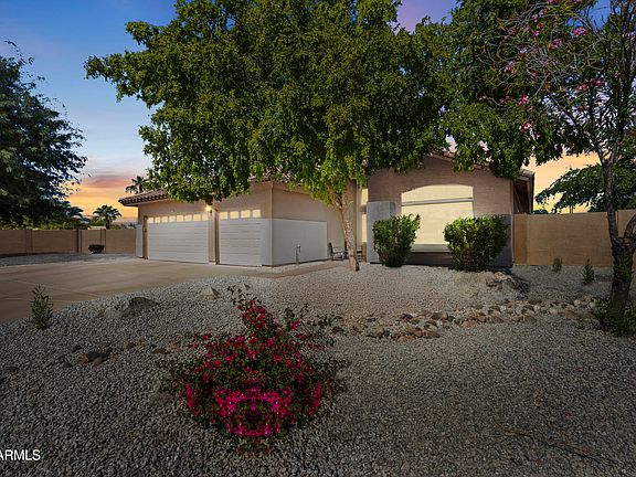 Fully remodeled home with vaulted ceilings, natural light, private pool, RV pad, pickleball court, paver patio, turf yard, and space to add a workshop or casita. This spacious 3-bedroom, 3-bath home with a bonus flex room sits on an oversized lot with new trees and high-end updates throughout. Enjoy brand-new flooring, an open concept layout, and a reimagined kitchen featuring clean-line cabinetry, quartz counters, a large center island, and abundant storage. The bathrooms have been completely modernized with designer tile and fixtures. Backyard features maintenance-free turf, extended pavers, and a full-size sport court. Move-in ready with rare flexibility to expand. Step inside and you'll immediately notice the vaulted ceilings and bright, open layout filled with natural light. The entire home has been thoughtfully remodeled from top to bottom with new floors, updated fixtures, and a sleek, cohesive design throughout.