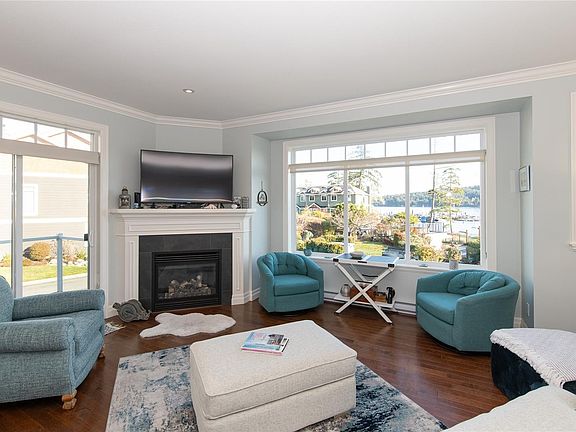 Rare Heron View town home offering some of the most magnificent, uplifting Ocean Views within this impressive oceanfront development. The upper main's elevated position overlooks the amenity centre & provides exhilarating views over the harbour, generous kitchen layout with quartz counters, SS appliances & gas cooking, white shaker cabinetry, mocha stained hardwood floors through the open concept main adjacent dining and spacious living room with gas fireplace and huge picture window to soak in those views! You'll love the master suite with NEW custom walk-in, ensuite & private patio with slider access. A 2nd large living room down with 2 bedrooms & 4 piece bath, rear patio round out the lower level. The townhome boasts a prized double garage with larger than average driveway. An amenity pkg beyond compare: Tennis, Swimming Pool, Gym, Sauna, Social Room, Social Gas Fire Pit. Nearby fine dining options, adjacent to marinas, launch your kayak from the private beach.