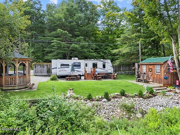 Must see this BEAUTIFUL Lakefront property on desirable Brant Lake! This is a .43 acre parcel on the east shore of the lake with 30ft of lake frontage. Boardwalk leading out to the dock & boats & you can swim off your own 10x10 private swim platform. Unobstructed views of the lake and gorgeous evening sunsets! Beautifully landscaped and a large slate patio abutting the spacious RV that sleeps 6. APA approved 8x12 Screened Gazebo & 8x12 Cedar Shed, both with electricity. Everything at the site is included (RV, kayaks, ,aluminum boat, paddle boat, exterior log furniture, interior furniture, grill/smoker, etc.). Close to I-87, town and hiking trails. This is NOT a buildable lot but you won't want to miss this one!