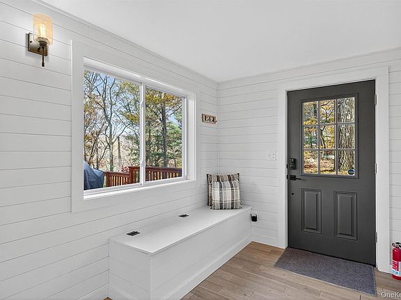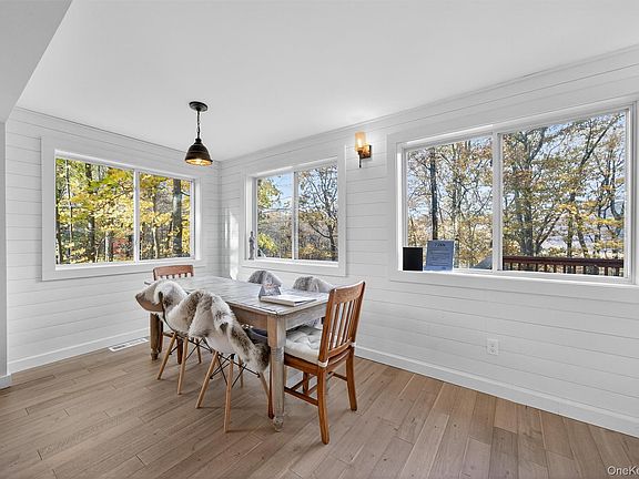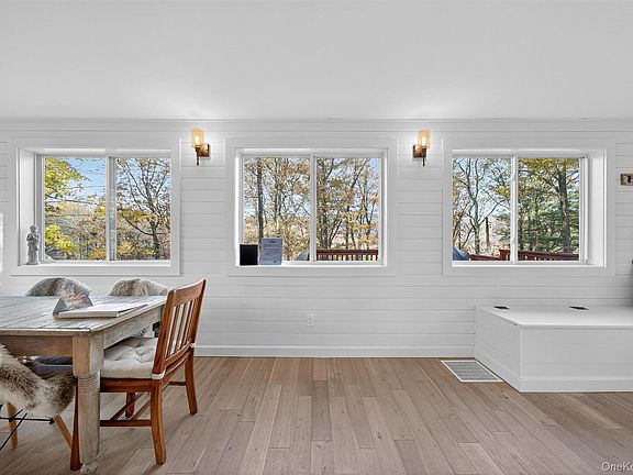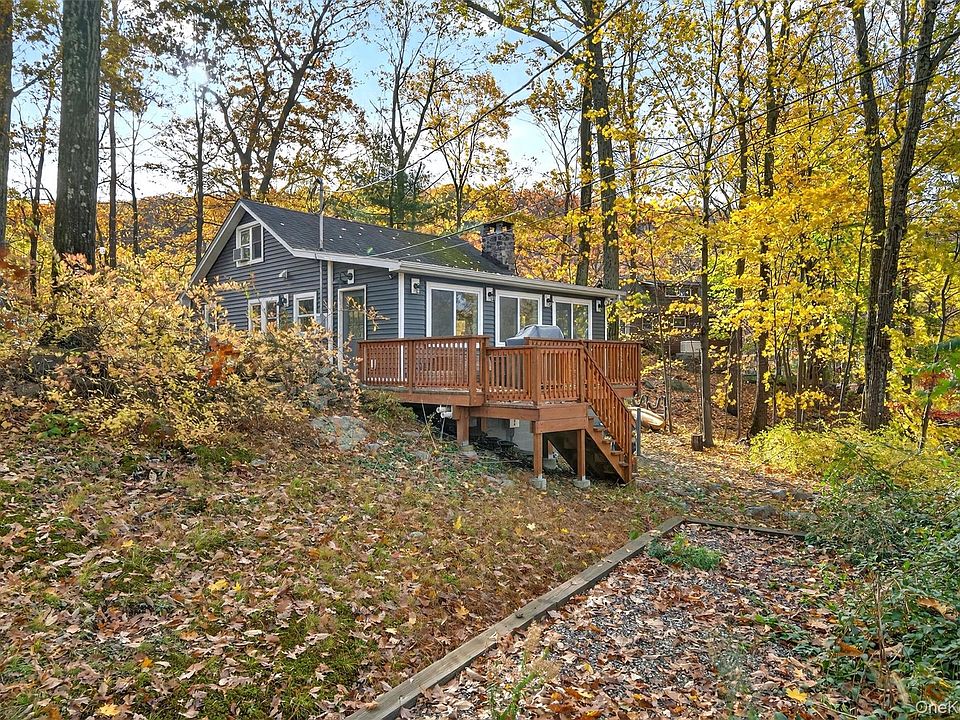 A quick escape from New York City, this charming cottage offers a serene retreat for a six-month short-term rental. Nestled in a wooded setting and within walking distance to Greenwood Lake, the home provides warm, welcoming spaces and a sense of comfort from the moment you step inside. The charm starts with wood floors, and partially vaulted ceilings that open up the living areas, creating an airy atmosphere throughout. A dining room that presents spectacular views. The spacious living room centers around a wood stove with a stone surround, providing a cozy focal point for gatherings or quiet evenings alike. Two comfortable bedrooms balance the home, accompanied by a full bathroom and a revamped kitchen that blends practicality with modern touches. A second-level loft adds flexible space for sleeping, a home office, or a quiet retreat, while a large basement offers a washer and dryer for everyday convenience.