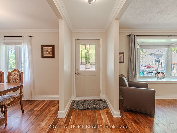 **Charming 1.5-Storey Detached Home With 2-Car Garage!** Ideally located minutes from transit and Hwys 400 & 401, this home offers a perfect blend of updates and convenience. The main floor features acacia hardwood (2022), crown moulding, newer doors, and an updated 4-pc bath (2022) with marble floors. The living and dining rooms are spacious and soak in the natural light. The bright kitchen on the main floor boasts a new stove (2022-never used). Two of the 3 bedrooms, including the primary, are located on the 2nd floor. The primary bedroom includes a private 2-pc ensuite (not usually available with this style of home) with storage, a double closet, and ceiling fans with remotes. The finished basement provides excellent flexibility with a potential in-law suite, complete with a spacious kitchen, an open concept design including a 3-peice bath, large pantry and utility room. Pot lights, ceramic flooring, and appliances complete the suite space. Enjoy the convenience of a **large detached 2-car garage** (1 auto door), on-demand hot water heater (owned), and additional parking (up to 10 cars in total), sprinkler system, separate electric panel in the garage, a private lot with a brand new retaining wall on the north side (a 30K+ value). Come visit this wonderful family-friendly home that is not only versatile but filled with modern upgrades in a prime location!