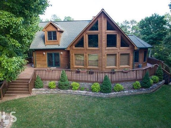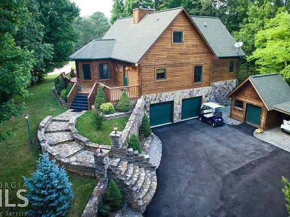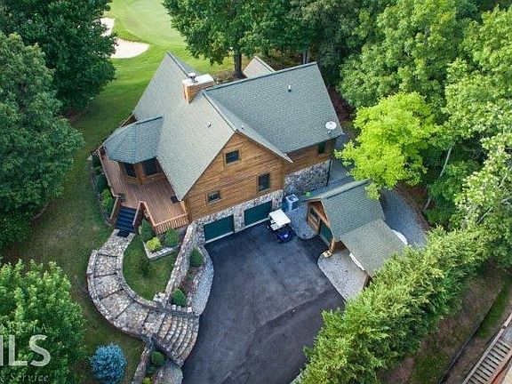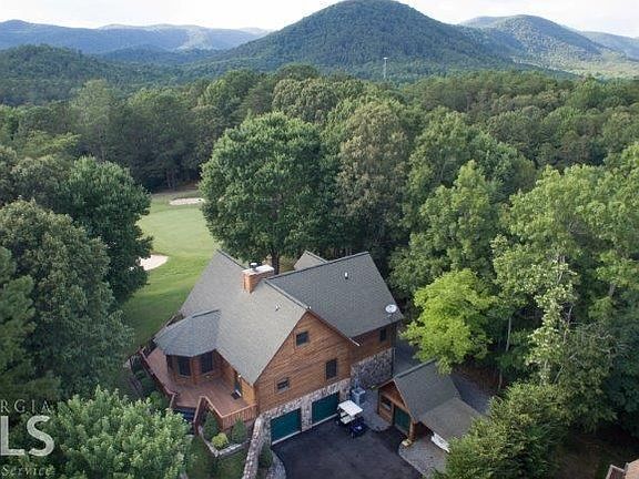 Superlative Golf Course Home!! Log Construction! Uniquely positioned on FRONT ROW of # 6 Green & Sand Traps! Log & Stone construction w/cathedral ceiling & wall of glass windows in the living area. Beautiful wood interior w/two-sided fireplace between kitchen & great room. View is focused out across the deck & the green beyond. Spacious kitchen w/granite counters, breakfast area & separate dining area. Master on Main w/large master bath incl. separate tub, tile shower & double vanity w/hammered copper sink basins. Open staircase to loft & upstairs BR. Daylight basement has den, bedroom, full bath & Laundry room & drive-under garage. Outbuilding for more storage PLUS covered parking for your golf cart too! Dont miss this very special Mountain/Golf Course Home
