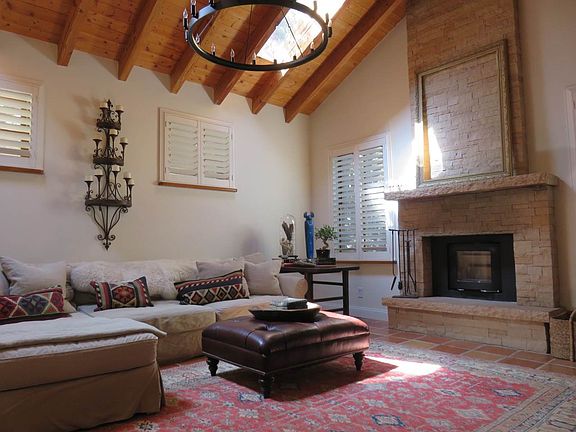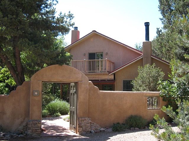Gated compound in desirable Big Tesuque Canyon. Located close to the Little Tesuque Creek and 1/4 mile from Windsor Trailhead to Santa Fe National Forest. The house has been thoroughly renovated and the outdoor spaces are wonderful. Walled and landscaped entry courtyard, flagstone patios, and two separate wooden decks. Gourmet eat-in kitchen is open to the dining area. The living room has a vaulted ceiling with beams and a large fireplace with gorgeous stone work. New Buderus radiators upstairs and radiant heat downstairs. Many, many upgrades include: remodeled kitchen with granite countertops and clay backsplash tiles, Rohl fireclay farmhouse sink, Subzero refrigerator, Viking stove and dishwasher and convection microwave. Samsung HE washer/dryer, new Prestige water heater and boiler, Nuvo water softener. New efficient wood burning insert in the living room. New outside gutters and coyote fencing, all new 6 panel doors and new exterior doors in kitchen and upstairs hallway that are ironclad on the outside. Baseboard molding, new lighting and wood shutters throughout. The downstairs bath has updated new tiled shower with a seamless glass door and subway tile surrounding the new sink set into a wood cabinet with Restoration Hardware. Hand hewn teak wood floors on stairs and 2nd and 3rd levels. New Buderus radiator heaters in den and bedrooms. Upstairs bath has a radiant towel warmer, clawfoot tub, Carrera marble shower with seamless glass and thermastatic fixtures.