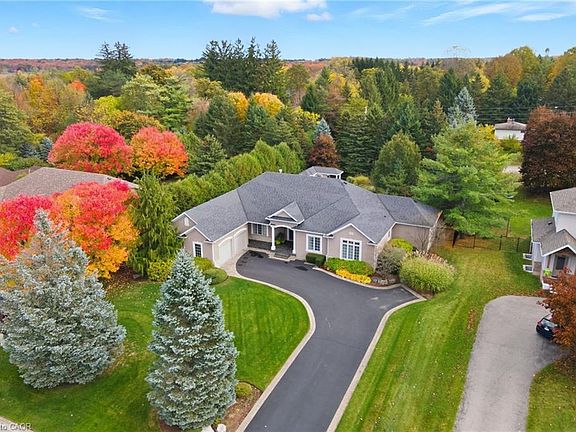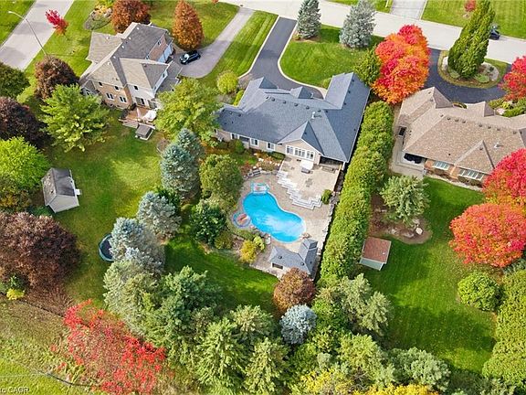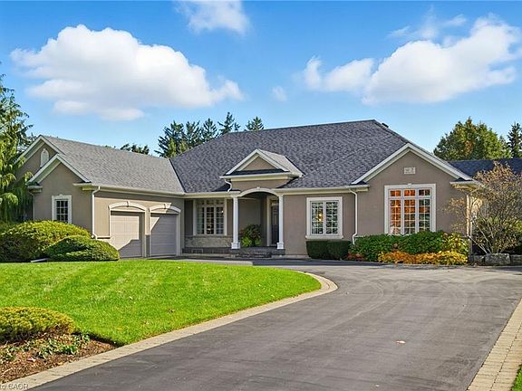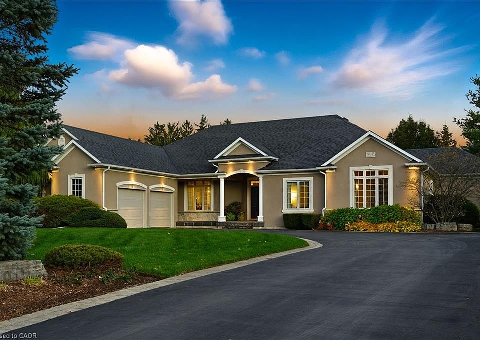 This sprawling bungalow offers over 2500 square feet of finished space on one level boasting 4 bedrooms and 2 bathrooms nestled in a cul-de-sac in the sought after neighbourhood of Carlisle. Featuring 10-foot ceilings and exquisite finishes throughout, this home blends luxury and comfort in every detail. The main entrance immediately welcomes you to a grand foyer finished with tumbled marble, and offering with beautiful sightlines highlighting your beautiful backyard. This home is filled with natural light and inviting charm. The large family room boasts hardwood flooring, california knock down ceilings, pot lights and a 2 way fireplace into your front facing formal dining room with coffered ceilings. The spacious entertainers kitchen features sharp grey cabinetry with black soapstone, centre island, built in appliances, raised breakfast bar, coffee nook, and direct back yard access. This home features a split floor plan which has the bedroom area tucked perfectly away from the living space. The primary bedroom offers a cozy retreat with its own fireplace, broadloom carpeting, spa like 5 piece en-suite and a generous walk in closet. The additional 3 bedrooms all generous in size offer walk in closets or double closets, and picture windows. The main 4 piece bath has been perfectly designed for a growing family with a massive vanity with quartz counter tops, shower tub combination and porcelain tiles. The lower level of this home awaits your finishing touches and is equipped with a rough-in for a future ensuite, offering potential for further customization. With no detail overlooked step outside to your private backyard oasis, complete with a 2 level entertaining area, covered porch for barbecuing, a kidney shaped salt water pool, and a large pool house with wet bar. This home is ideal for hosting, relaxing, or simply enjoying peaceful evenings outdoors.
