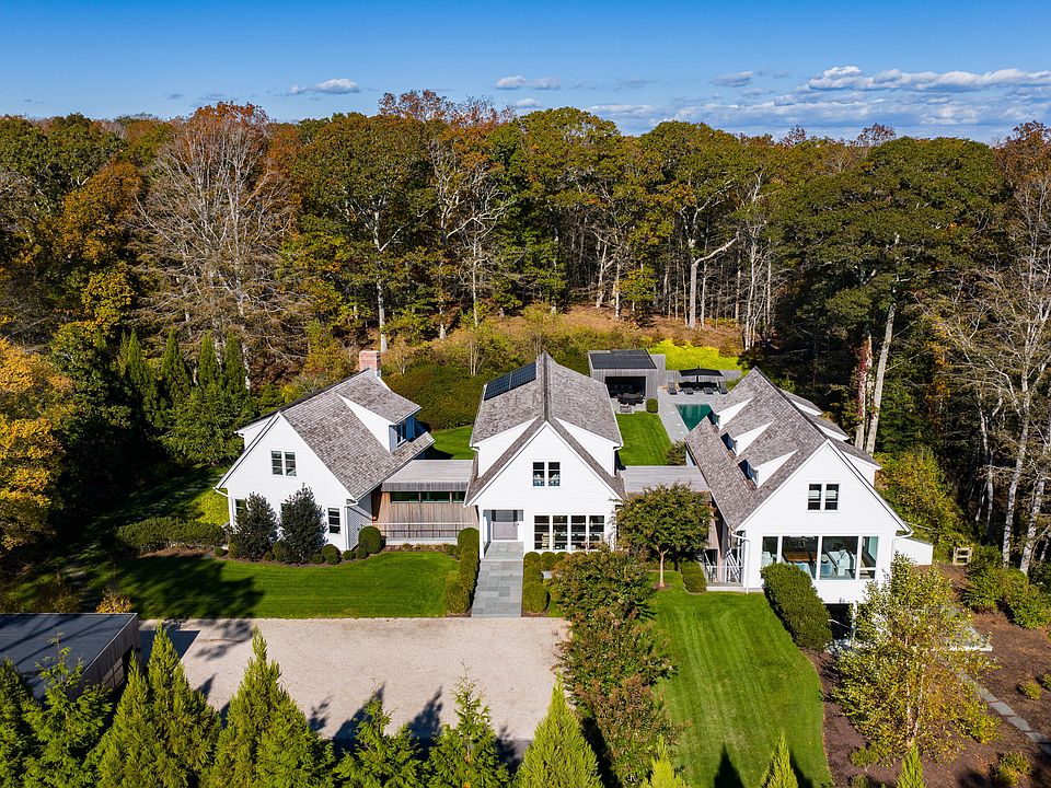 Nestled on two picturesque acres, this stunning property features a private driveway and gated entry. Constructed in 2020 by renowned builder Larry Kane, the home seamlessly blends traditional and modern elements, and is abundant with natural light throughout. Upon entering through the front door, you are greeted by a gourmet chef's kitchen boasting an expansive island for seating, complemented by a dining area and an airy living room highlighted by a fireplace and soaring double-height vaulted ceilings. The kitchen seamlessly flows out to the pool area, perfect for seamless indoor-outdoor living. The main level also features a luxurious primary suite with a spa-like bathroom and a spacious walk-in closet. Adjacent, you'll find a well-appointed library with custom shelving, alongside an additional office or bedroom. Convenience is key with a side door entry and mudroom providing ample storage space. The upper levels of the house are divided into two wings, each offering two guest bedrooms with their own bathrooms, ensuring privacy and comfort for family and guests. The lower level is an entertainer's dream, complete with a wine room, theater room, gym, and a spa featuring a sauna, steam shower, soaking tub, and more. Two additional bedrooms with en-suite bathrooms, and a dedicated laundry room complete this level. Outside, the backyard oasis features meticulous landscaping surrounding a heated gunite pool and spa. A spacious yard provides ample room for relaxation and play, while an open pool house/cabana equipped with a fridge, sink, and outdoor shower enhances the outdoor living experience. Additional amenities include a two-car garage with extra storage space. Enjoy the serenity of two acres of lush wooded privacy on a quiet cul-de-sac, just moments away from Amagansett town amenities and the ocean. This property offers a rare blend of luxury, functionality, and tranquility, perfect for those seeking a sophisticated private retreat in a coveted location.