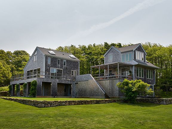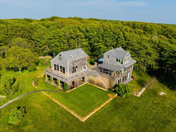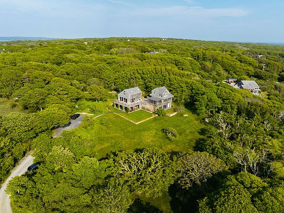 This unique hilltop property is located at the end of a private drive, surrounded by the natural beauty of Aquinnah. It consists of two separate contemporary "Acorn houses," creating airy, light-filled environments and offers views over the expansive, meadow-like lawn that extends toward the ocean. From this vantage point, you can enjoy breathtaking views of the Atlantic Ocean, the Elizabeth Islands, a glimpse of the North Shore, and the Gay Head Lighthouse. The main house, built in 1973, features a top-floor primary suite, with the kitchen, living, and dining areas located on the main/middle level. On the first floor, there are three guest bedrooms, one of which is currently set up as a media room, and a full bathroom. Similarly, the guest house, built in 1988, includes a top-floor primary suite and an open-concept kitchen, living, and dining area on the main level. The first floor has two guest bedrooms, with one currently configured as a home gym, along with a full bathroom. In 2021, the houses were joined, expanded, and renovated by AD100 designer Billy Cotton. They are connected by a spacious wrap-around deck on the main level and by a hallway with plenty of storage closets and a large laundry room on the first level. The homes can be separated by closing a barn-style door on the first floor. This design allows the homes to function together for multigenerational families or to provide space and privacy for multiple families or guests. Both homes are equipped with a full kitchen and dishwasher. Plans for expansion are available including an additional structure, and an envelope to construct a pool.