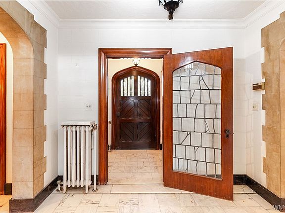 Completed in 1927, this Tudor-style residence stands as a testament to an era when quality, artistry, and enduring beauty were paramount. Set just outside Buffalo’s city limits in the heart of Amherst’s coveted Pomeroy Park neighborhood, this architecturally significant home helped define the area’s character. Set on just over an acre, a circular driveway leads to a large detached garage and the home’s rear entry. Its exterior blends hallmark Tudor elements—brick, stucco, slate, and wood—with timeless appeal. Inside, these materials carry through, highlighted by a grand two-story living room featuring exposed mahogany trusses, leaded glass windows, a magnificent carved stone fireplace, and a tiered venetian glass chandelier imported from Murano, Italy.