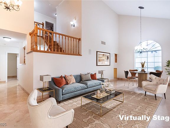 Tucked in a quiet cul-de-sac near The District and Green Valley Ranch, this elegant 4-bedroom home offers comfort, space, and a prime location. A versatile downstairs bedroom with an adjacent ¾ bath is ideal for guests or a home office. The open kitchen features granite countertops, stainless steel appliances, ample cabinetry, and a serving counter overlooking the family room with a fireplace. Upstairs, the spacious primary suite offers vaulted ceilings and a second fireplace. Secondary bedrooms include ceiling fans, crown molding, and custom closet organizers. The laundry room is conveniently located upstairs. Outside, enjoy a sparkling pool, a covered patio, and a freshly painted exterior. The oversized 3-car garage includes shelving and backyard access. Brand-new HVAC systems provide efficiency and peace of mind. This move-in-ready home blends timeless design with an unbeatable location.