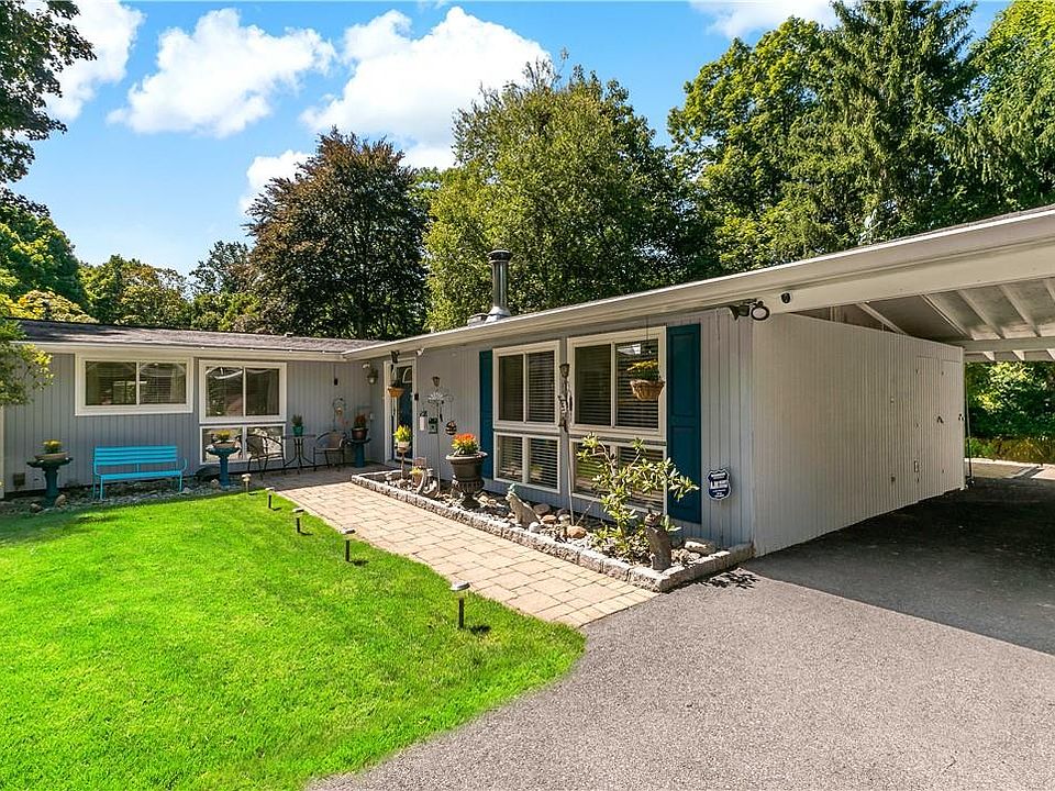 Welcome to this mid-century Ranch in move-in condition situated on a beautifully landscaped .30 of an acre and convenient to all. Sun-drenched, vaulted ceilings & open concept w/modern eat-in kitchen connects to dining/living room w/wood-burning stove. Chef's kitchen w/granite counters, spacious island, new ceramic floor, maple cabinets, stainless steel appliances. Large primary bedroom with updated bathroom, two bedrooms, an updated second bathroom & laundry area. Kitchen & dining area have sliders that lead to the bright enclosed porch (addt'l 168 sq ft) & large stone patio & backyard. Private setting w/pretty perennials, green lawns & evergreens. Lots of storage: 5 large closets, built-in cabinets in the living room, a wall of storage in carport & shed. Newer Navien tankless hot water heater, washer/dryer & replaced entire driveway. Convenient to shops, restaurants, bus, highways. Residents have access to Hartsdale Metro North station parking (35 minute train to NYC). Greenburgh rec. Don't miss it! Additional Information: Amenities:Storage,