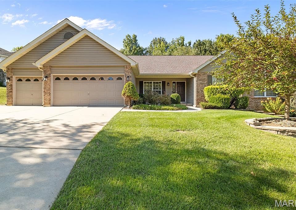 Turn key 4 bedroom custom ranch home in the desired Briarwick subdivision in St. Peters! Three car garage and in-ground sprinkler system. Stunning backyard oasis with a waterfall, fire-pit and patio perfect for entertaining! Meticulous lush landscaping. Convenient main floor living. Bright and airy vaulted ceilings and open floor plan. Updated kitchen with custom cabinetry, granite countertops, a center island and stainless steel appliances. The primary suite has a walk in closet, bay window with a sliding glass door leading to the backyard, and full bathroom with double sinks, a tub and separate shower. The huge finished lower level has a full kitchenette, recreation/family room, office and bedroom with a full bath (new carpet in LL 2024). New Roof (2020), New HVAC (2019).