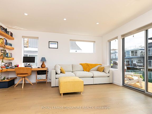 Condo in the City with Million Dollar Views!!!! Custom-built in 2022 with all the creature comforts of home. Boasts over 650 sq.ft of nautical style living on the water! White oak plank flooring, LED pot lights throughout. Open concept layout w/built-in desk, floating entertainment shelving right & breakfast bar. Two-tone navy blue lower cabinets with w/white upper cabinets include oak counters with accented gold handles, bringing an authentic nautical look to the modern vibe of the place. White propane Classic by Unique Stove has a classic old-fashioned nautical look with a contemporary twist. The Galanz glossy white fridge w/matching microwave lends itself to the modern but classic style of a house on the water. The primary bedroom includes a built-in White Oak queen bedframe w/floating side tables along with nautical overhead lamps for night time reading. The wall-to-wall closet boasts loads of storage. The view through the sliding doors overlooking the 65 sqft. cedar deck is perfect for watching sunrises. The crawl space type storage means you can store your off season items and water toys without extra costs. Mooring Fees ($1220) include tax