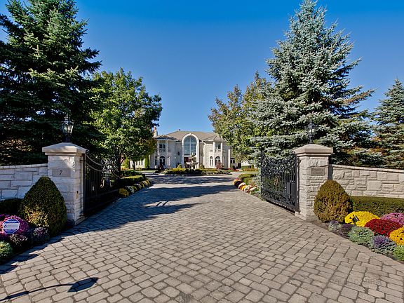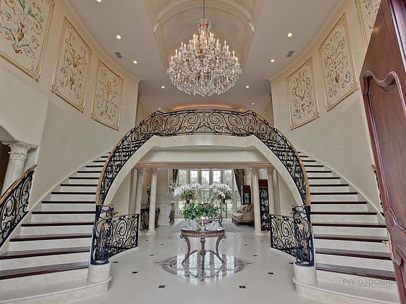 Spectacular approach upon entering through the electronic gates, paver drive & lovely fountain to this manicured 3.8 acre property. The home's grand entry is unparalleled to most w/ a 20' intricately detailed ceiling, marble inlaid floors, double bronze staircases that open to the exceptional lower level, Shoenbeck chandeliers, 5 custom carved fireplaces & indoor smart spa w/ pool. This one of a kind masterpiece took 4 yrs to construct. Gourmet Clive Christian kitchen has mahongony cabinetry & opens to two story family rm. 1st flr library w/ built-in bookshelves. Master bedrm suite has a carved FP, cove ceiling, outdoor terrace, luxurious bath w/ heated floors & steam shower w/ onyx inlay floors. Lower level incl a full kitchen, movie theater, recreation rm w/ bar, game rm, dual glass front wine cellars & exercise rm w/ sauna/steam & shower. Impressive 3,000 SF limestone patio w/ bluestone inlays & Greek columns overlooks lush grounds. Extensive security system. Simply magnificent!