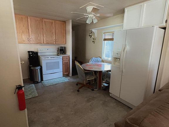 Discover your cozy retreat in our welcoming 55+ community! This charming single wide mobile home has been lovingly updated and is ready for you to move in. The heart of the home is the beautifully renovated kitchen, featuring ample cabinets, marbled countertops, and a modern glass top stove. It's a space where you can truly enjoy cooking and entertaining. The bathroom has been fully modernized, showcasing a stylish tile shower that brings a touch of luxury to your daily routine. The windows feature vinyl frames and elegant faux wood blinds. Accessibility is a key feature, with a sturdy ramp at the front making entry easy and safe. Additionally, the property includes the largest shed/workshop in the community - perfect for your hobbies or extra storage and a white picket fenced back yard. Included with the home are a refrigerator, washer, dryer, and oven, ensuring you have everything you need from day one. Come see this delightful home for yourself.