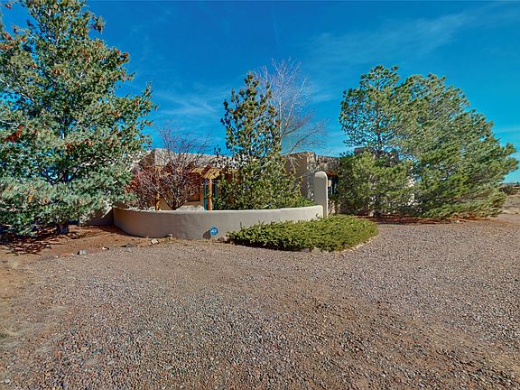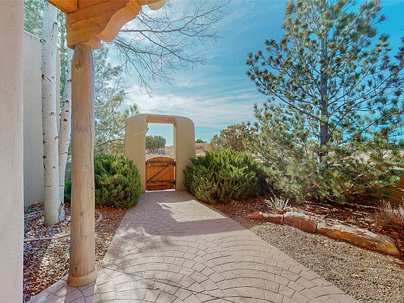 Enter through a private front courtyard with established landscaping and mature trees to this elegant single-level Eldorado home with a generous covered portal and classic Santa Fe details. Open concept living room/dining room with high ceilings, vigas, and plastered kiva fireplace. Cook's kitchen includes a large island, pantry, breakfast area, stainless appliances, granite countertops, and a built-in desk. An outdoor patio with coyote fencing for privacy and securing furry friends is just off the dining area, perfect for entertaining. Built on a 1.7-acre lot, the home includes a second living area off the kitchen with a kiva fireplace, which would make a great media or game room. An office/studio space off this bonus room is very private with endless potential (originally a third garage bay). The primary bathroom has double sinks, tall countertops, a separate shower and tub, as well as a large walk-in closet. Separate laundry room. Lots of storage. Heated garage. Just a 20-minute drive to Downtown Santa Fe. The Eldorado community offers hiking/biking trails, a grocery store, a seasonal pool, a library, a Senior Center, a dog park, restaurants, and many other amenities. Schedule a showing today.