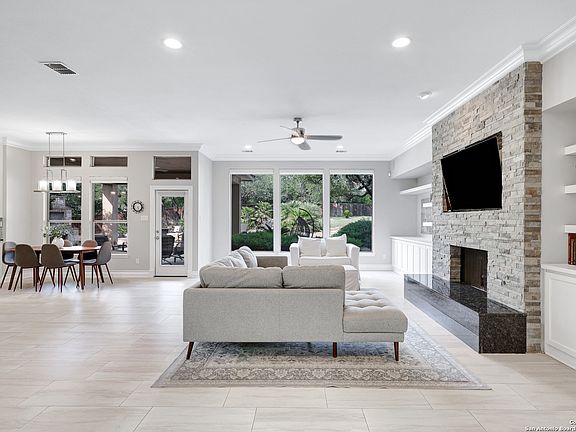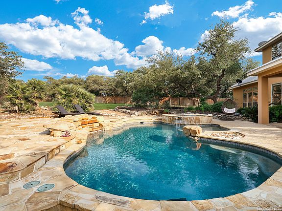 Stunning custom home in the prestigious, guard-gated Champions Ridge community and just under an acre!! Welcome to your very own vacation at home! Relax on the large covered patio overlooking your completely private back yard with Keith Zars Pool & Spa with waterfall feature. The landscaping in the front and backyard has been meticulously cared for! This spacious, open floor plan home highlights high ceilings, tons of windows/natural light, NEW tile flooring (downstairs), a game room area upstairs, and a formal dining area. The open floor plan offers a kitchen with granite countertops, huge island, built-in stainless-steel appliances, including wine fridge, six burner GAS stove, subway tile backsplash, large walk-in pantry, a breakfast nook, lots of counter and storage space and much more. The enormous family room features a gas fireplace and two built-in nooks with custom shelves/cabinets. The master retreat highlights trey ceilings, wood flooring, an UPDATED bathroom with a walk-in shower, stand alone garden tub, separate vanities, and his & hers walk-in closets. Large windows throughout the home provide lots of natural light and bring the outdoors in. Guest suite and true study downstairs! Walk upstairs to see your huge game room & 3 secondary bedrooms. Two bedrooms share a Jack & Jill bathroom. The fifth bedroom has its own bathroom. No carpet!! The flooring consists of hardwood and tile throughout, and there is abundant storage space, including a walk-in attic. This home is an indoor and outdoor entertaining paradise!! The other exterior features consist of beautiful landscaping/flower beds, stone fireplace, 4 sided masonry, full sprinkler system and mature trees. The home has a 3-car garage, water softener, metal roof, and gutters. Just minutes from shopping, restaurants, activities, and highly desired NEISD schools. Do not miss out on this incredible Stone Oak POOL/SPA home on a HUGE private lot!