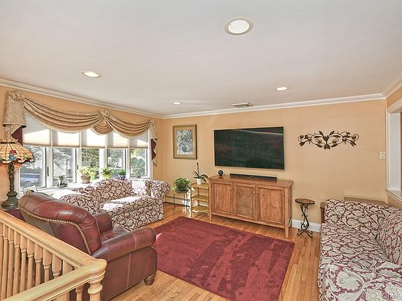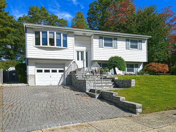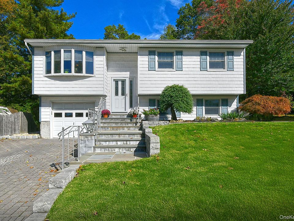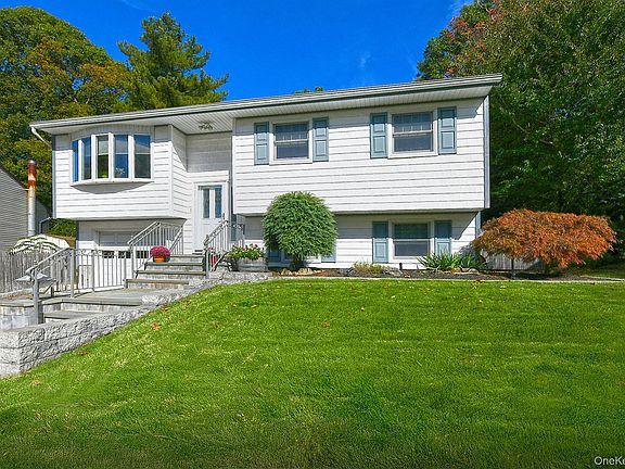 Welcome to 7 Cardiff Court! True pride of ownership is evident in this beautifully maintained 4-bedroom, 2-bath Hi Ranch. The French country–inspired kitchen features a center island, granite countertops, tumbled marble backsplash, stainless steel appliances (including a Bosch dishwasher), gas cooking, a farmhouse sink, and abundant cabinetry. The kitchen opens to the dining area and bright living room with gleaming hardwood floors throughout. Both bathrooms have been tastefully updated. The spacious family room offers a cozy wood-burning fireplace and a convenient laundry area. Step outside to a lovely two-tiered Azek decking—perfect for relaxing or entertaining—overlooking a fully fenced, peaceful, and private backyard. Additional highlights include a blue stone stoop, cedar impression siding, Andersen windows, new Roth oil tank, one-car garage, and in-ground sprinklers. Located on an ideal cul-de-sac close to everything you need, this home is truly move-in ready!