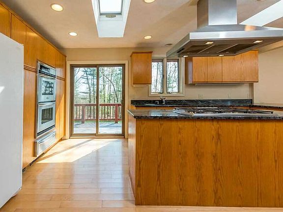 Amazing open floor plan contemporary on fantastic wooded lot in Bear Hill Estates! Stone fireplace living rm;hardwds throughout; massive lower level family rm w/FP & wet bar, sliders to deck; sun-drenched kitchen w/skylights, granite & center island.