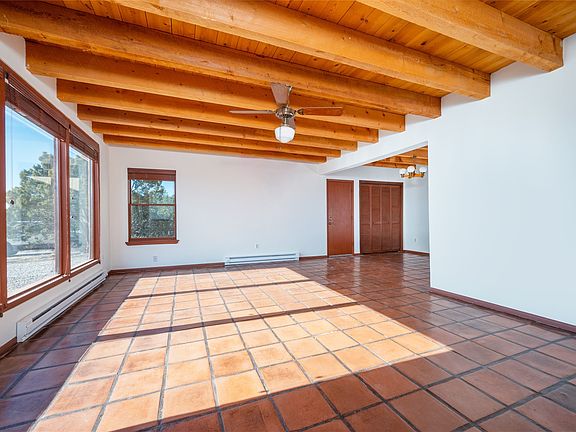 Home for the Holidays!! Come view this charming passive solar style home, strategically positioned to capture breathtaking views of the Turquoise Hills, Ortiz Mountains, and Sandia Mountains. Experience the beauty of New Mexico's stunning sunsets and stormy skies from the comfort of the enclosed and heated sunroom, located off the upstairs primary bedroom. Situated on almost an acre and a half of land, this property offers ample space for outdoor activities. With two full baths, including one in the primary bedroom upstairs, convenience is ensured for all occupants. The main living area features an open floor plan with Saltillo-style flooring and beamed ceilings, adding a touch of warmth and character to the space, while the bedrooms are carpeted for added comfort. The well-appointed kitchen boasts essential appliances such as a dishwasher, electric range, and refrigerator, providing all you need for culinary endeavors. Additional features include a newer hot water heater for your comfort and efficiency. The home is all-electric with natural gas available if desired. Water supply is through a shared well. This property offers a unique opportunity to enjoy New Mexico's natural beauty while providing comfortable living spaces. Don't miss out on this wonderful home – schedule a showing today!