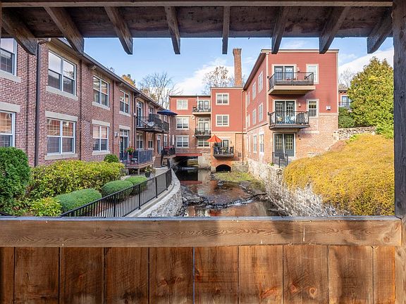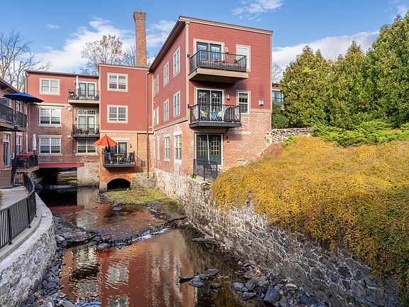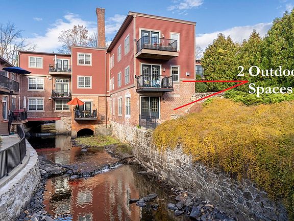 Unique Opportunity in Benjamin Chase Mill: Private entrance at ground level, gorgeous views of the stream, 2 Levels of outdoor spaces. When you enter on the main level, you'll see the a wide open living spaces including modern kitchen, dining room, living room with gas fireplace, balcony overlooking the water, 1/2 bath and space for an office nook. You'll love this area has high ceilings, exposed brick, huge windows with tons of natural light. The kitchen has newer appliances and granite counters ready for your culinary adventures. New easy to care for luxury vinyl plank floors. Descend the stairs to the sleeping quarters. There you will find two bedrooms, both with ensuite full bathrooms, laundry room and utility closet. The primary suite has a walk in closet, dual vanity bathroom and PRIVATE PATIO with double doors to the water views. This special condo's layout allows so much privacy and peace with only your unit above the bedrooms. The association has two gazebos in the common areas and access to the Beaver Brook Walking Trail. Conveniently located near shopping and dining. Close to commuting routes Interstate 93 and Rt 101. A lovely opportunity to call this place home. Quick close possible.