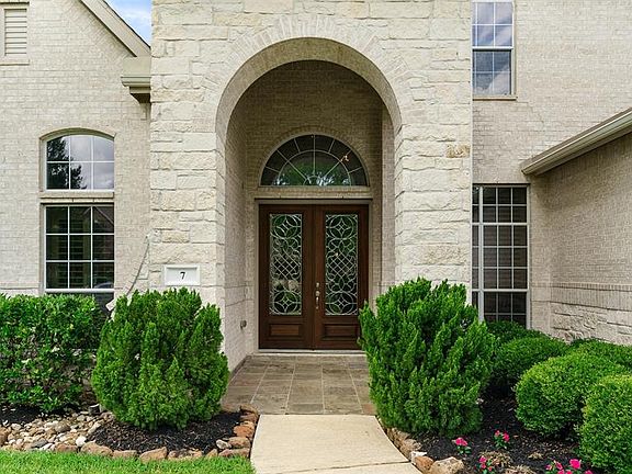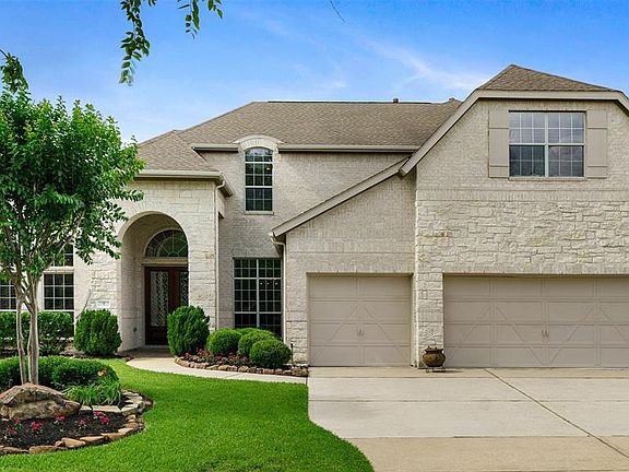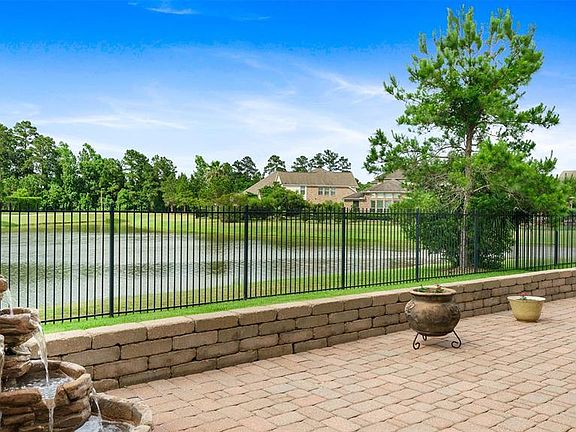 Immaculate waterfront home on a cul-de-sac lot in beautiful Village of Creekside Park. Double leaded glass front doors open to welcoming two-story foyer with sweeping wrought iron stairway. Rich wood floors in the formal dining and study with french doors. Plantation shutters throughout the home. Spacious living room with gas log fireplace, vaulted ceiling, and a wall of windows providing a breathtaking view of the lake. Chef's kitchen with extensive custom cabinetry and granite counters, stainless steel appliances, and large walk-in pantry. Private master suite features jetted tub, oversized shower, and large custom walk in closet. Additional bedroom and full bath down. Upstairs are 3 bedrooms, 2 full baths, and game room with large balcony overlooking the lake. Amazing backyard retreat with outdoor kitchen and extended Belgard Pavers patio to enjoy the gorgeous lake view. Fantastic location-short walk to top rated Creekside Forest Elementary and Fleming Park. No flooding!