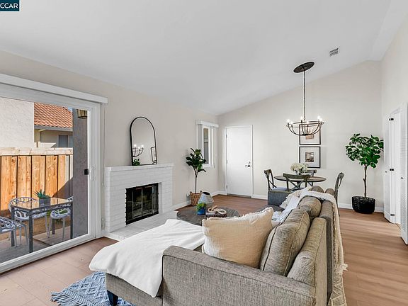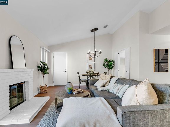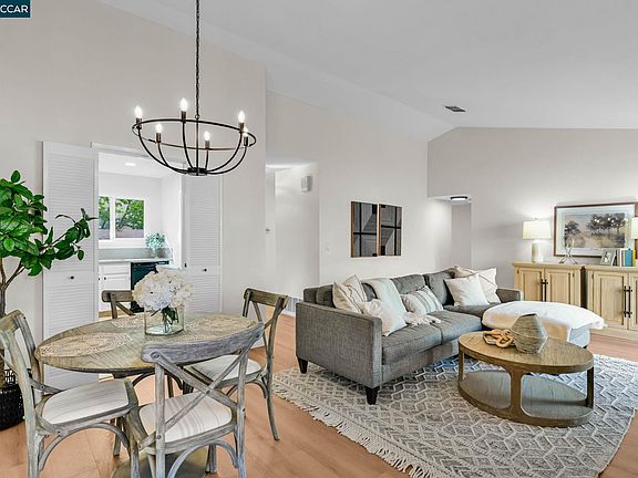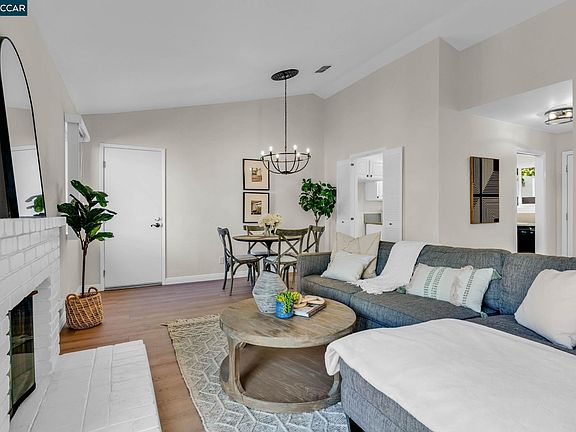 Spectacular single story end unit brimming with style and sophistication! Coveted neighborhood with a stunning surround of stunning Mt Diablo views! Splashed in natural light with vaulted ceilings, the spacious living room offers a cozy wood burning fireplace, new laminate flooring, new light fixtures, and walls of windows looking out to the sunny patio. Kitchen features include white cabinetry, solid surface counters, stainless steel appliances and designer black hardware. The primary bedroom is a tranquil retreat featuring vaulted ceilings, ample closet space and sliding French doors open to the quiet back patio. An updated bathroom has a newer vanity, stall shower and newer hardware and fixtures. A convenient office/3rd bedroom is situated in the middle of the unit and looks out to the quiet front courtyard. The attached two car garage is spacious and has laundry hook ups and storage space. Sunny and tranquil, the back patio is perfect for entertaining or romantic and elegant meals al fresco. This sought after location offers stunning views of Mt. Diablo and is just steps to the picturesque community swimming pool, scenic trails, and convenient proximity to charming downtown shopping and restaurants.