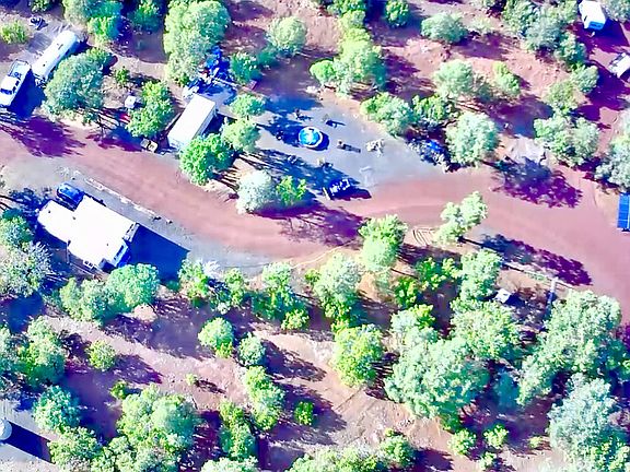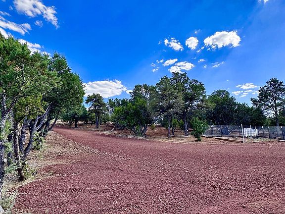 A true HIDDEN PARADISE! Located on a hill just a little less than a 1/4 of a mile off the Hwy are 3.77 acres of dense tall trees and scenic views offering the feeling like you are miles from anyone! The BEST part is that all of the hard work of developing the land has already been done! As you getting close to arriving at the property, you will pass the HUGE Alligator Juniper (in white fence) continue past about 400 ft and take the first driveway. This is a circle drive through the property, easy for pulling in Your Rv or trailers. Along the long cindered driveway up to the cleared homesite areas, you will be guided through beautiful tall trees that offer windows to the distant views. Tucked away & chosen for there views are cleared/leveled areas for your garage and/or up to a 40ft RV. Every part of the development has been meticulously and thoughtfully done and you'll love the large fire pit on chilly nights. Over 20 loads of cinder has been laid, Pinon pines and junipers beautifully trimmed and several loads of fill leveled for the RV parking area. Power is at lot as well as an impressive solar set up that will convey with a good offer, apx 360 ft to the lot line, or use the existing container that houses 3000W solar panels and 200amp lithium batteries, enough power to run an average 3 bd house! A new 1000 gal (3 bedroom) septic is also in place and ready to go! Ample water is available in the 3000 gal holding tank.