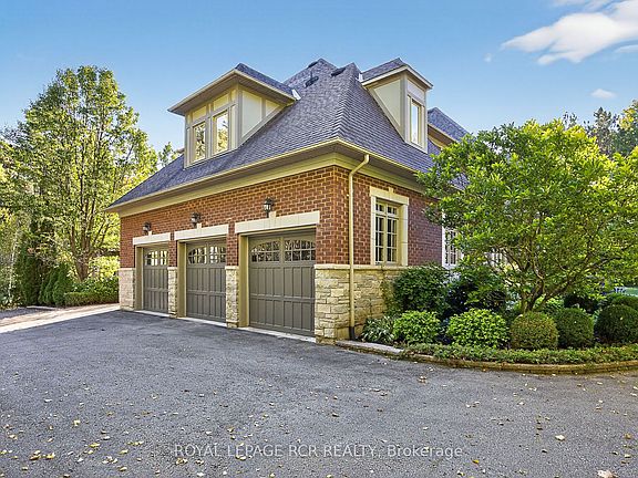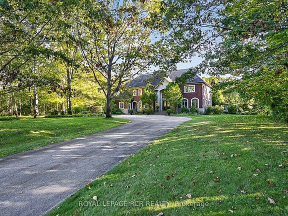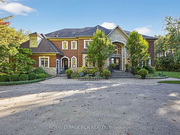 Dream big! Builders own 4964sf custom 5+ bedroom estate with separate entrance to professionally finished basement and 3 car garage on 2.31 very private, luscious and mature treed acres nestled on a quiet court in a very prestigious mature treed, picture book scenic enclave with forest trails that is conveniently located within minutes to downtown Uxbridge, hospital, all amenities and skiing. The Impressive main floor plan presents a hexagon shaped full season sunroom with fireplace, 19ft high huge great room with fireplace. A dream, entertaining-size fully outfitted and highly functional kitchen with lots of room for 2 chefs and fabulous breakfast area large enough for a big family and guests. Entertain in the formal living room with numerous windows and in the luxurious dining room with efficient servery. Work quietly in the main floor office with 2 walls of windows that is perfectly situated at the back of the home for undisturbed busy work days. This well designed floor plan is complimented with front and side mudrooms, main floor laundry and dedicated space for future elevator. The alluring sun-filled second floor boasts extra-wide hallways offering front and back breathtaking views. A large family will appreciate 5 spacious bedrooms with ensuites. Two of the bedrooms are designed for primary suites and are situated at opposite ends of the home with each suite presenting sitting rooms, large en-suites and walk-in closets. The professionally finished basement with separate entrance and oversized windows boasts a large kitchen with entertaining sized dining area, huge bedroom, spacious recreation room, 3 piece bath, and huge storage areas available for future expansion. This welcoming space is perfect for in-laws or extended family. This breathtaking property located in the desirable Foxfire enclave backs to a forest trail, presents a long driveway, fabulous hardscaping & gardens and large manicured areas to accommodate a future pool and sports court if desired.