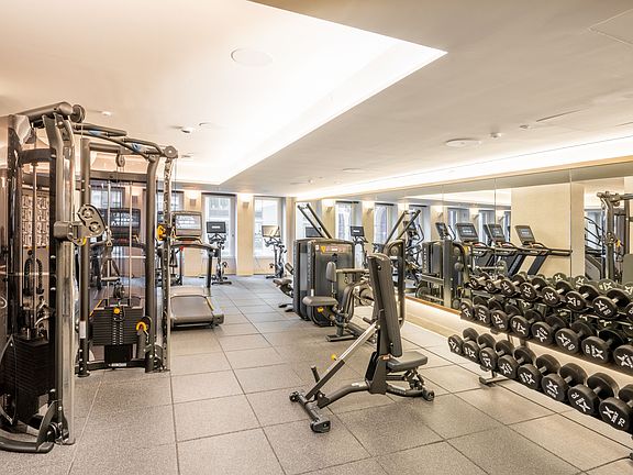 This thoughtfully designed building boasts two indoor lounges and outdoor terraces, a fully equipped fitness center and yoga studio, and several workspaces.