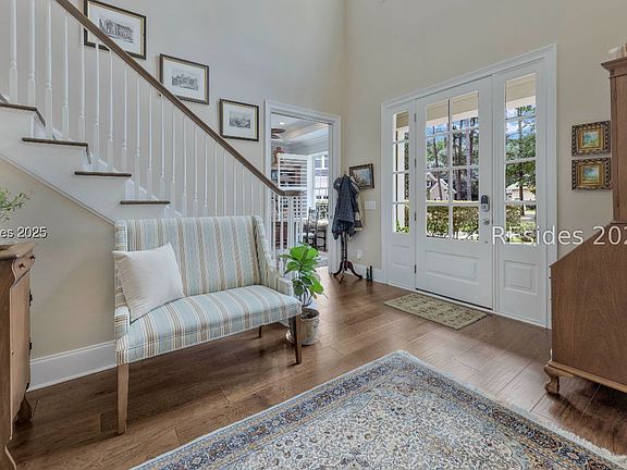 Nestled on a serene, private wooded lot at the end of a quiet cul-de-sac in the gated community of Hampton Hall, this stunning 5-bedroom + office, 5.5-bath residence offers the perfect blend of Lowcountry elegance and modern comfort. A charming paver driveway welcomes you home, setting the tone for refined living just minutes from Bluffton's vibrant heart. Step inside to the spacious first floor, where the luxurious Primary Bedroom Suite serves as a tranquil retreat. The open living area offers a soaring cathedral ceiling and cozy fireplace, ideal for gatherings or quiet evenings. A dedicated office provides a peaceful workspace, while dual staircases, front and back, effortlessly connect to the upper level. The gourmet kitchen is a chef's delight, boasting expansive countertops, abundant storage space, a pantry, a convenient Butler's Pantry, and a built-in wine refrigerator for effortless entertaining. Ascend to the second floor to discover a generous bonus living space and four en-suite bedrooms, each offering privacy and comfort. The oversized fifth bedroom, perched above the garage, presents endless possibilities as a media room, play space, or guest haven. Outdoors, unwind on the expansive covered and screened porch, which flows seamlessly to a patio and a fully fenced backyard backed by deep, lush woods for a true outdoor oasis for al fresco dining or lazy afternoons. The attached two-car garage includes a climate-controlled 10'x13' bonus room with a 10-foot ceiling, ready to transform into your dream storage, fitness studio, home office, or creative space. This home shines with recent enhancements over the past 5 years, including a new roof, sleek updated kitchen countertops, fresh second-floor carpeting, a completely renovated Primary Bath with heated floor, refreshed Guest Bath, and thoughtful upgrades throughout. Conveniently centered in Bluffton, SC, Hampton Hall delivers unmatched accessibility: mere moments to premier shopping, dining, groceries, and entertainment. Venture under 10 minutes to the enchanting Old Town Bluffton, perched along the pristine May River, or cross the bridge to Hilton Head Island in 15 minutes for 11 miles of white sand beaches, world-class activities, delectable cuisine, and seasonal festivals. This is Lowcountry luxury at its finest ... schedule your private tour today!