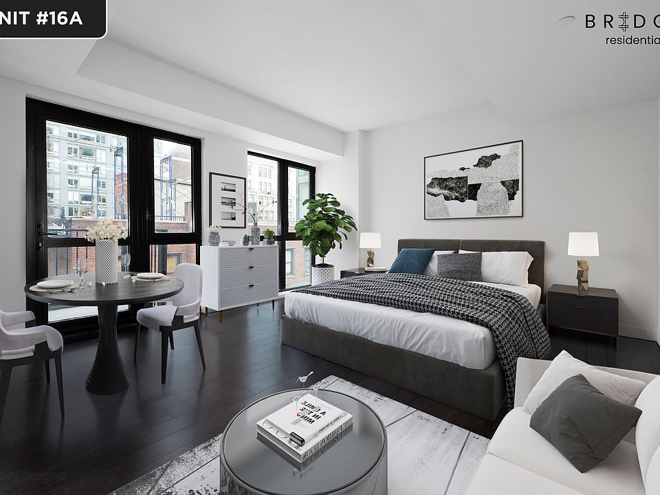 Residence 16A offers a refined studio layout with wide-plank hardwood floors, oversized windows, and a modern kitchen featuring quartz countertops and premium stainless steel appliances. The home includes an in-unit washer/dryer, elevator access, and ButterflyMX virtual doorman for secure, effortless living.