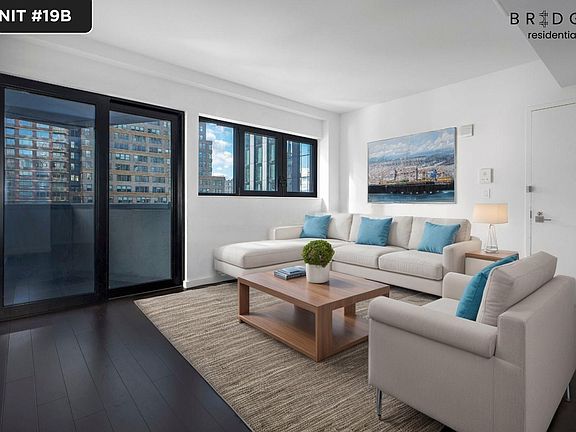 Residence 19B offers a refined 1 bedroom layout with wide-plank hardwood floors, oversized windows, and a modern kitchen featuring quartz countertops and premium stainless steel appliances. The home includes an in-unit washer/dryer, elevator access, and ButterflyMX virtual doorman for secure, effortless living.