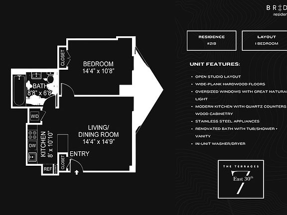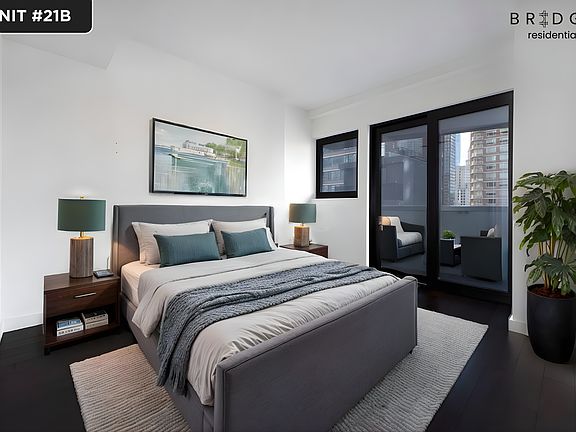 Residence 21B offers a refined 1 bedroom layout with wide-plank hardwood floors, oversized windows, and a modern kitchen featuring quartz countertops and premium stainless steel appliances. The home includes an in-unit washer/dryer, elevator access, and ButterflyMX virtual doorman for secure, effortless living.