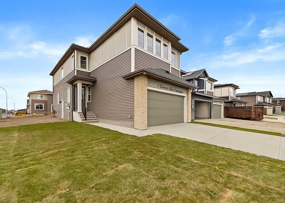 CONVENIENT SIDE ENTRY | MAIN FLOOR BEDROOM & FULL BATH | CORNER LOT. Welcome to this exquisite Anthem BUILT Signature Home in the highly sought-after and fast-growing community of Cornerstone, where modern living meets natural surroundings. This beautifully designed 2-storey home offers over 2,200 sq.ft. of exceptional craftsmanship and thoughtful detail — perfect for large or multi-generational families. Step inside to discover a bright and open floor plan featuring luxurious vinyl plank flooring, high ceilings, and a gourmet kitchen equipped with quartz countertops, sleek stainless steel appliances, including an gas stove, French door refrigerator, and built-in microwave. A walk-through pantry and spacious center island make this kitchen both stylish and functional. The main floor bedroom with a full bath provides the ideal space for guests or extended family, while large windows fill the living and dining areas with natural light, enhancing the corner lot’s open feel. Upstairs, you’ll find four generous bedrooms, including a stunning primary suite with a spa-inspired ensuite featuring dual vanities, a soaker tub, stand-alone shower, and a walk-in closet. A central family room separates the primary suite from the additional bedrooms, ensuring privacy and comfort. The upper level also includes a large laundry room, plus a main bath with dual vanities. Additional highlights include an expanded dining area, side entrance, and corner lot location. Perfectly situated close to the Calgary International Airport, with easy access to Deerfoot Trail and Stoney Trail, and surrounded by ever-growing amenities, this brand-new home delivers both luxury and practicality, ready for your family to move in and enjoy!