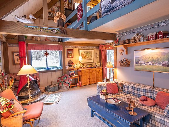 Absolutely idyllic swiss chalet in the Spruce Lake Estates community of Wilmington, with shared lake access, a beach area, tennis court, and more. This lovely home sits just outside the village of Wilmington for shopping and dining, as well as near to the Mount Snow ski resort, and the nearby larger lakes. The owners have updated and maintained the home since the 80s and are moving on to the next chapter, allowing a new owner to make just as many great memories. Inside the home you will find true post and beam construction with beautiful open spaces. There is a vaulted living room with scandanavian fireplace that throws great heat, tremendous natural light thanks to many windows, a large open kitchen and dining area also vaulted, a main floor primary bedroom with walk-in closet and full bath, a good sized guest bedroom and bath upstairs, as well as large loft for overflow sleeping or entertainment space, two lower level guest bedrooms, a third full bath, large entry mudroom area with coat closets and laundry room with second fridge and extra owner storage, outdoor brick entry, firewood shed, garden shed, wraparound deck for outdoor enjoyment, and a lovely private lot with stream adjacent to the home. This home is lovely and turn key, but could also be updated for tremendous rentability and equity growth. Being offered furnished less decor and personal items. Seller is moving abroad so would like to close late fall. One lower bedroom does not have legal egress.
