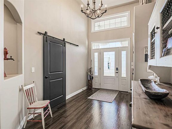 Exceptionally designed five bedroom, three bathroom walkout bungalow on a sprawling pie-shaped lot with RV parking, rear yard access, and located in one of the most admired closes in Sylvan Lake! The exterior showcases beautiful stonework and durable Hardie Board siding, while the grand entry welcomes you with elevated ceilings and decorative lighting. The open concept main floor features a gourmet kitchen with updated appliances, granite countertops, soft-close custom cabinetry with crown moulding, a large island, and tile backsplash, adjoining the bright dining and living area. The primary suite offers a private retreat with a luxurious ensuite including dual sinks, soaker tub, separate shower, and a walk-in closet. Two additional bedrooms, a laundry room with cabinetry, mudroom, and another full bathroom complete the main level. The fully finished walkout basement is an entertainer’s dream with a large family room, wet bar with wine fridge, theatre space, and two additional bedrooms with walk-in closets and no-touch switches. The full bath features dual vanities and a sliding privacy door. The lower level is complete with additional storage and fair sized utility space that offers updated furnace equipment with UV light filtration, water softener, in-floor heat to keep toasty. Enjoy lake views and fireworks from the west facing deck with Duradeck finish and built-in speakers. The backyard oasis includes a partially covered patio with screens, two custom sheds, black aluminum greenhouses with planters, raised garden beds with solar lights, and drive-through yard access. The heated double garage has a floor drain, and the extended driveway offers ample parking including a 31ft RV pad with hookups and sanitary dump. Pride of ownership shows inside and out, in a welcoming close known for its block parties and caring demeanour. The location is ideal being so close to parks, schools, shopping, and lake itself.