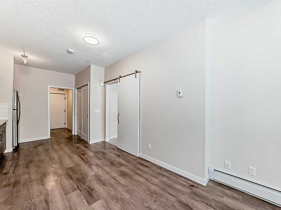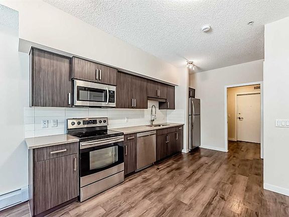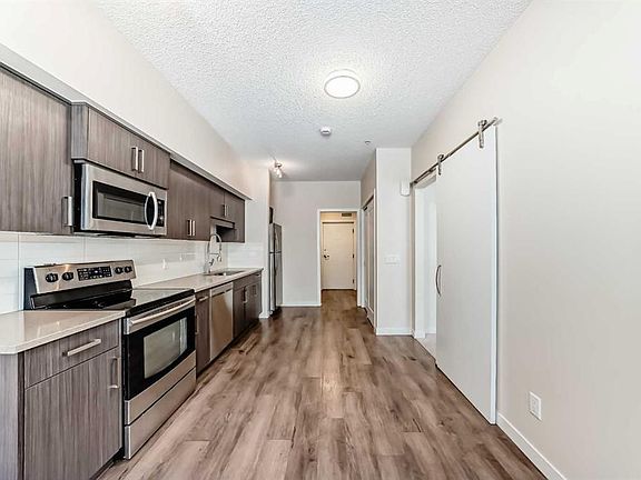 Welcome to Eighty5Nine by Morrison Homes – stylish condo living in Calgary’s sought-after Upper West Side. This main-floor 1-bedroom unit features a private entrance, open-concept layout, luxury vinyl plank flooring, and a sleek galley kitchen with quartz counters and stainless steel appliances. A sliding barn door opens to a bright bedroom with a desk nook, large closet, and 4-piece bath. Enjoy in-suite laundry, ample storage, and your own titled heated parking stall with direct unit access. Relax on your front patio with BBQ hookup, or gather in the landscaped courtyard. Steps from shops, dining, transit, parks, and pathways, with easy downtown access and a quick escape to the Rockies – this is West Side living at its finest.